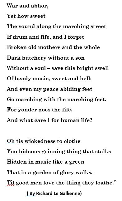 From earliest history there has been a fascination and a glamour about war that has always appealed to men, and sometimes to women. We may show that war is horrible and wicked and sorrowful, but history and poetry are saturated with the thought that it is heroic, and noble and beautiful. Men go out from their homes at the call to arms. They say it is sweet and pleasant to die for one’s country. Women, with their arms around the necks of their husbands and brothers cry sobbingly “Go and God be with you.”  The martial drum and trumpet lend their music to add to the patriotic fervor and help to increase the illusion.